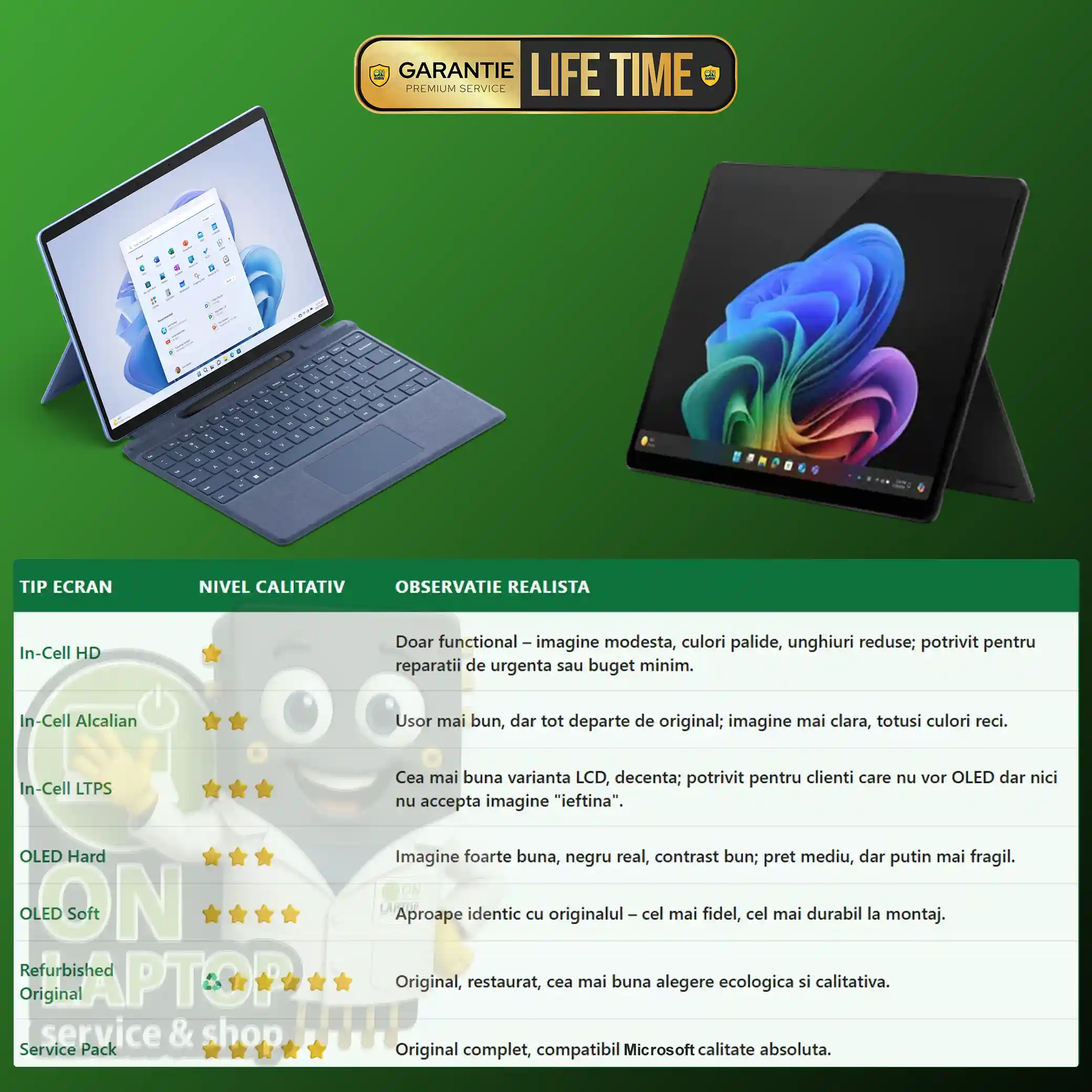 | Refurbished Original | ♻⭐⭐⭐⭐⭐ | Original Microsoft Surface restaurat – cea mai bună alegere ecologică și calitativă. |
