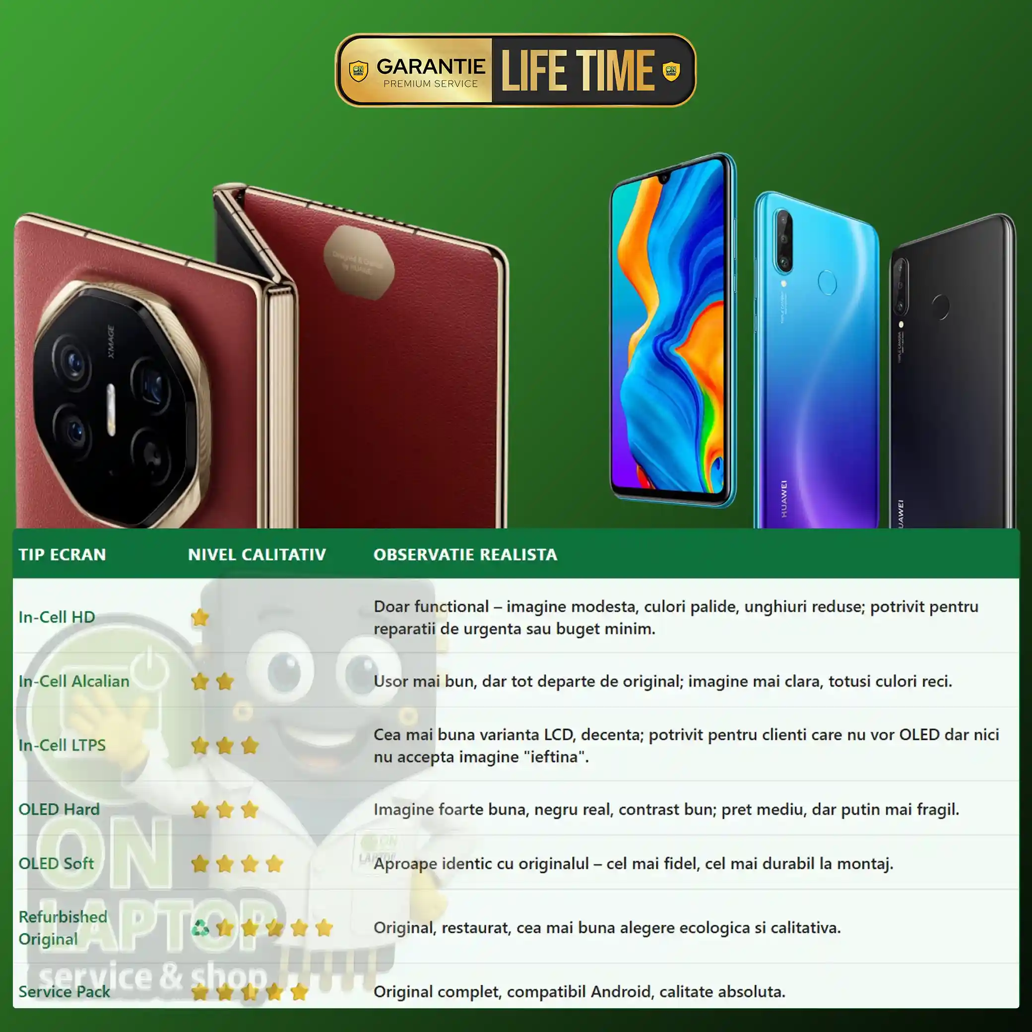 | Refurbished Original | ♻⭐⭐⭐⭐⭐ | Original Huawei restaurat – cea mai bună alegere ecologică și calitativă. |